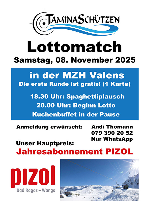 Ab 18:30 Uhr gibt es einen Spaghettiplausch, und ab 20:00 Uhr wird Lotto gespielt – mit schönen Preisen wie Früchtekörben, Fleischkörben, Gutscheinen und als Hauptpreis ein Jahresabo der Pizolbahnen.